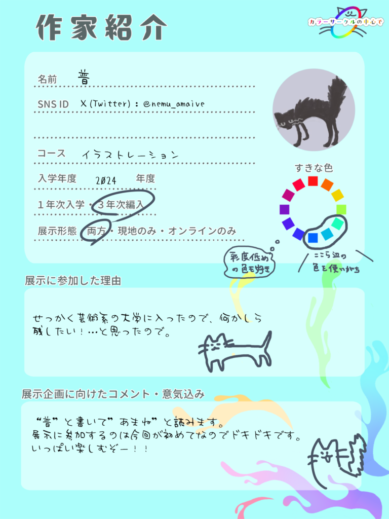 ホーム展示者展示者:オンライン、現地 普 関連リンク X(旧Twitter):@nemu_amaiveInstagram : @nemu_amaive 自己紹介 東京都在住。懐かしさや苦しさ、寂しさをまとめて包み込んだような優しい世界を表現したくて絵を描いてます。甘えん坊の黒猫と暮らしている。 このページのURLをコピー 他の展示者も見る マンネンカンモウキ 展示者:オンライン、現地 Ao 展示者:オンライン、現地 せい 展示者:オンライン、現地 もっと他の展示者を見る