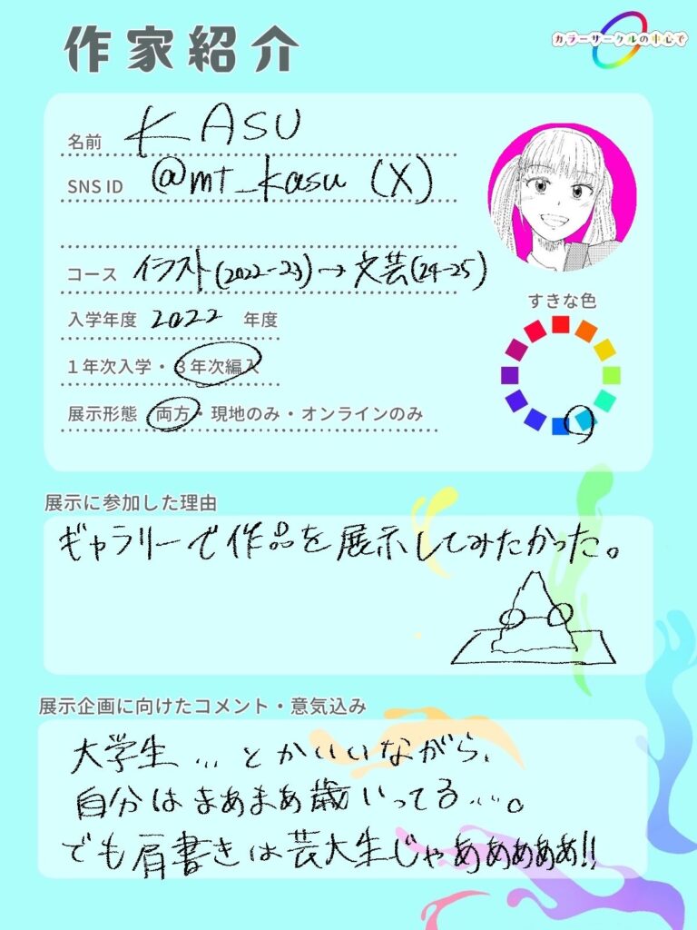 ホーム展示者展示者:オンライン、現地 KASU 関連リンク X:@mt_kasuマンガ:マンガフォリオその他連絡先SNSまとめ:POTOFU このページのURLをコピー 他の展示者も見る てんちゃ 展示者:オンライン、現地 路地 展示者:オンライン、現地 こふ 展示者:オンライン、現地 もっと他の展示者を見る
