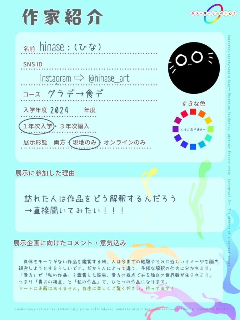 ホーム展示者展示者:現地限定 hinase 関連リンク 任意の追加情報 自己紹介、自主制作の宣伝、その他諸々…… このページのURLをコピー 他の展示者も見る ハナタロウ 展示者:現地限定 せい 展示者:オンライン、現地 Q 展示者:オンライン、現地 もっと他の展示者を見る